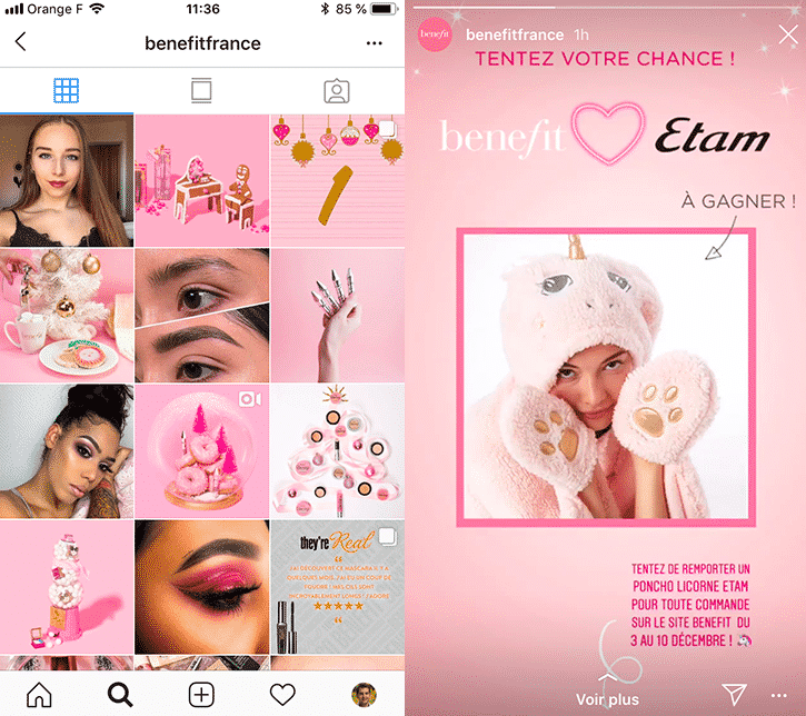 Dans l’exemple ci-dessous, la marque de cosmétiques utilise différentes nuances de rose sur l’ensemble de ses publications classiques & Stories Instagram :