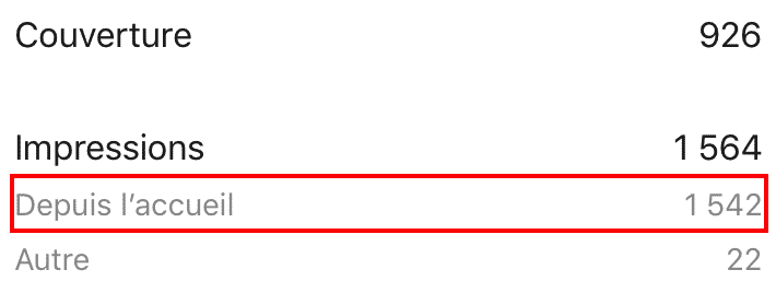 - observez les publications ayant les meilleures performances pour la donnée « Depuis l’accueil », c’est-à-dire le nombre d’affichages de votre publication auprès des personnes étant abonnées à votre compte :