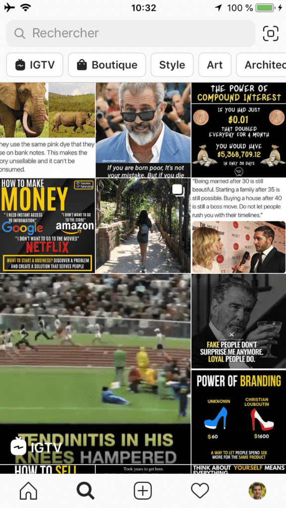 Une fois que les utilisateurs Instagram ont fini de consommer les publications & Stories de leurs abonnements, ceux-ci se rendent souvent dans la rubrique « Explorer », c’est-à-dire l’écran accessible en cliquant sur la petite loupe en bas à gauche de l’application.