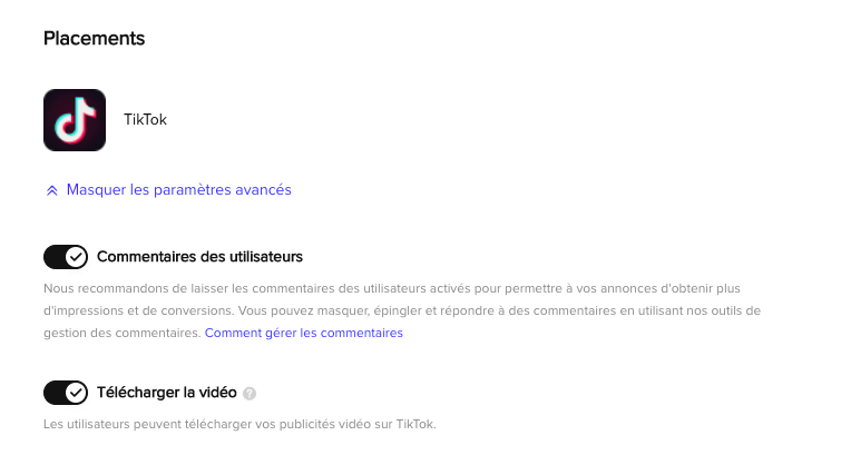 Vous devrez ensuite configurer la rubrique « Placements », correspondant à l’endroit où votre publicité sera affichée. Dans le cadre de l’objectif « Interactions avec la communauté », la campagne ne pourra être affichée que sur TikTok, et non sur des sites partenaires.
