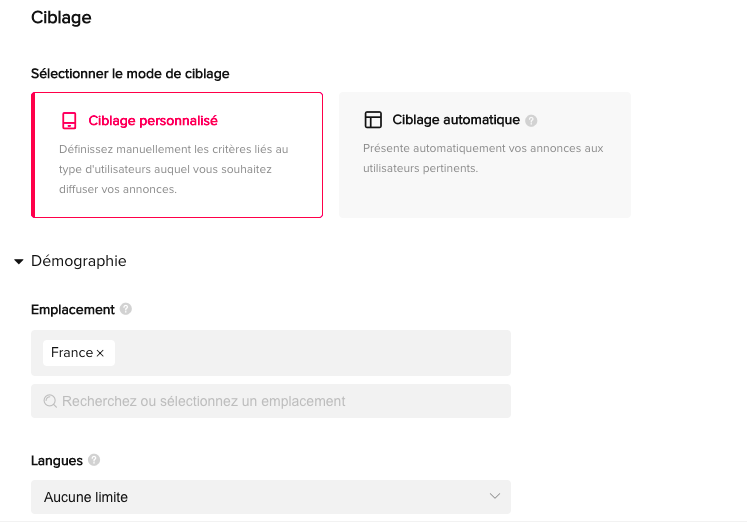 De la même manière que dans le mode simplifié de création de campagne publicitaire TikTok, il vous sera demandé de choisir entre « Ciblage personnalisé » et « Ciblage automatique ».