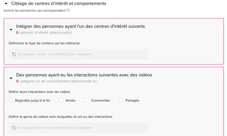 Vous pourrez également renseigner un ciblage par centres d’intérêt et comportements :