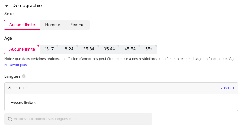 Vous pourrez alors choisir les données démographiques des personnes ciblées à savoir :