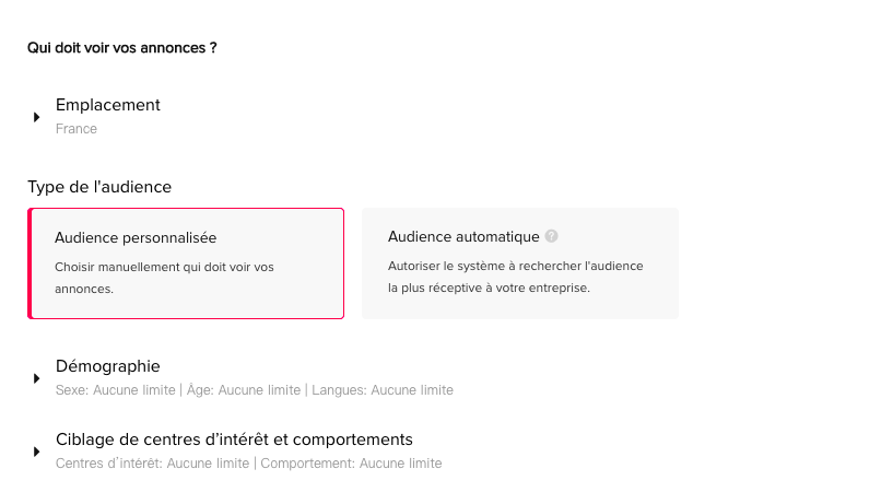 - le type d’audience entre « Audience personnalisée » et « Audience automatique »