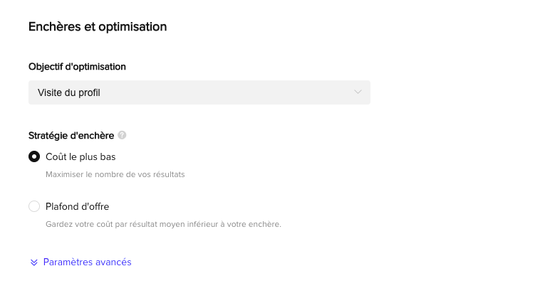 Vérifiez que l’objectif d’optimisation correspond bien à l’objectif de campagne choisi initialement, et que la stratégie d’enchère soit « Coût le plus bas ».