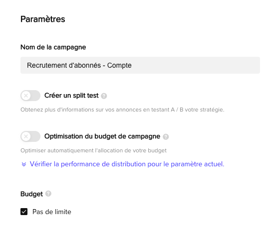 - si l’on souhaite activer l’optimisation du budget de campagne (comparer plusieurs audiences)