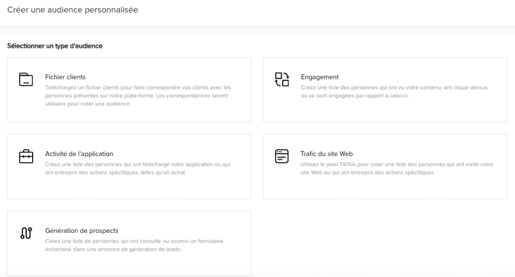 Je vous conseille de toujours passer par le type d’audience personnalisée afin d’avoir la main sur les personnes atteintes par votre campagne publicitaire TikTok.