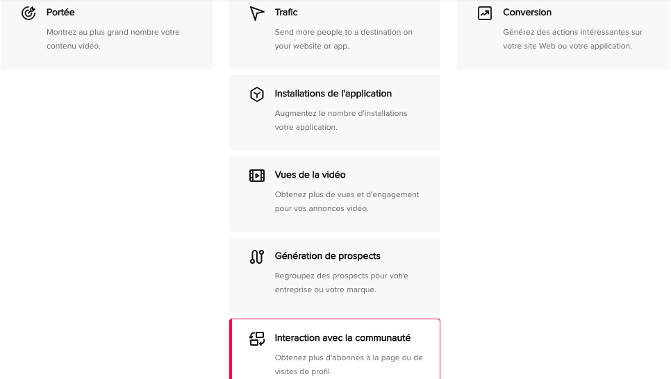 Dans le cadre de cet article, je choisirai l’objectif « Interaction avec la communauté » pour gagner plus d’abonnés sur le compte.