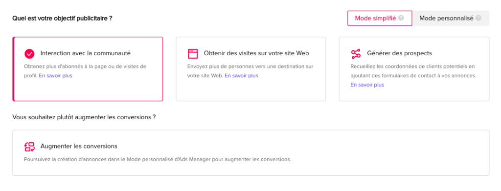 - Augmenter les conversions (Poursuivez la création d’annonces dans le Mode personnalisé d’Ads Manager pour augmenter les conversions)