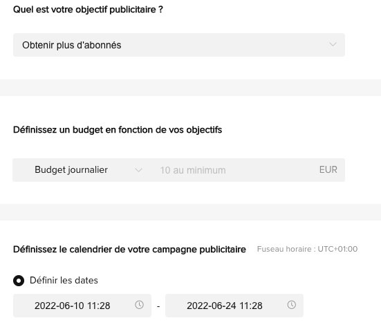Ensuite, il vous sera nécessaire de renseigner le budget et calendrier de votre campagne, avec un minimum de 20€ par jour.