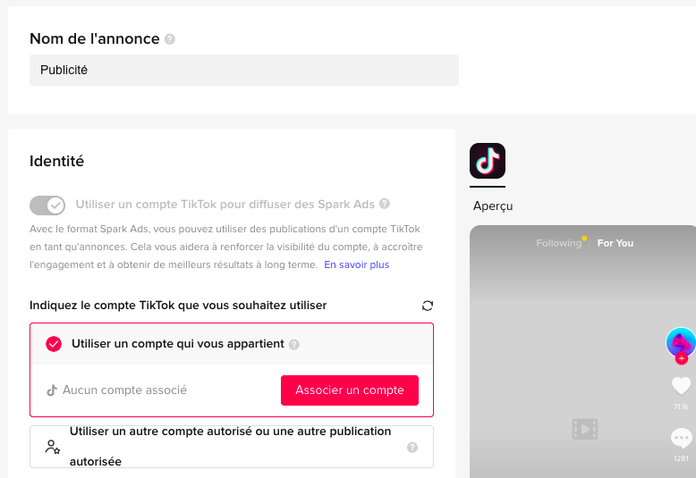 Ensuite, il vous faudra associer le compte TikTok depuis lequel faire partir l’action sponsorisée, étape incontournable lorsque l’on choisit l’objectif « Interactions avec la communauté » (il est possible de diffuser des publicités sans compte associé avec d’autres objectifs).