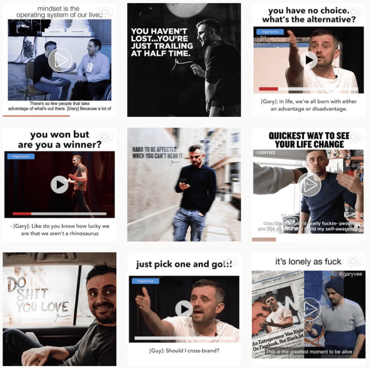 Deuxième exemple : l’entrepreneur américain Gary Vaynerchuk au plus de 3 millions d’abonnés se servira de contenus photos & vidéos afin de prodiguer ses conseils business, en développement personnel et en communication social-média avec une utilisation prononcée du texte sur chacun des visuels :