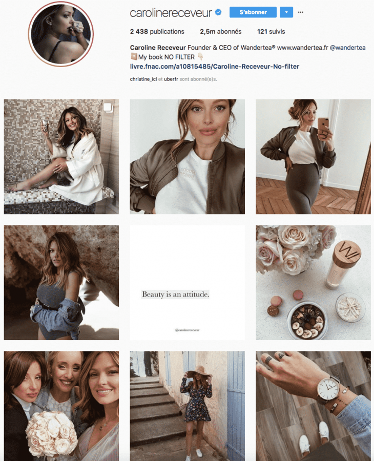 Dans ce premier cas, il n’est pas question de chercher à poster tout le temps le même type de contenu mais utiliser régulièrement les mêmes couleurs ou tout du moins le même univers de couleurs/filtres. Dans le premier exemple ci-dessous, nous remarquons que les couleurs nacre & marron sont très présentes sur les différentes photos publiées, ce qui donne immédiatement un style bien particulier.