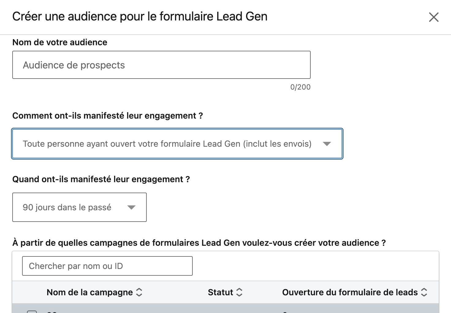 Par exemple, vous pouvez créer des audiences de reciblage basées sur des formulaires de prospects. Lorsque vous créez une nouvelle audience, sélectionnez toutes les campagnes Document Ads que vous souhaitez utiliser comme source d’audience. Créez ensuite des publicités axées sur la conversion pour guider les prospects plus profondément dans l’entonnoir.