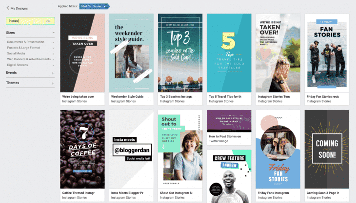 Si vous consultez régulièrement des Stories d’influenceurs ou de marques, vous reconnaîtrez sans aucun doute des modèles dans cette liste. Une fois que vous avez trouvé le style qui vous convient, vous pourrez le modifier à votre guise et ensuite le télécharger sur votre ordinateur :