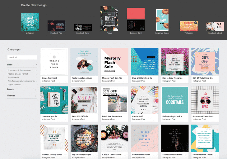 Ensuite, de nombreux types de visuels adaptés aux dimensions des réseaux sociaux vous seront proposés, comme nous pouvons le voir ci-dessous :