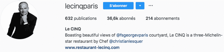 49ème exemple de bio : le Cinq. Le texte permet de nous informer de la proximité du restaurant avec l’hôtel Four Seasons George V à Paris, et mentionne le compte Instagram du chef étoilé.