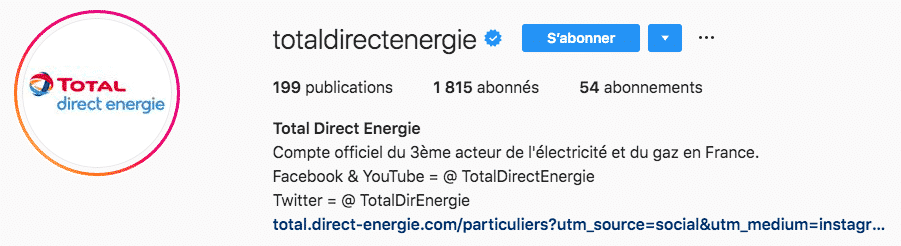28ème exemple de bio : Total Direct Energie. La première ligne de la biographie est destinée à informer le visiteur de la position de l’entreprise sur le marché. Les suivantes en revanche informent des noms d’utilisateurs de la société sur les principaux réseaux sociaux du marché.