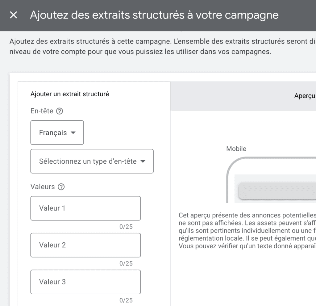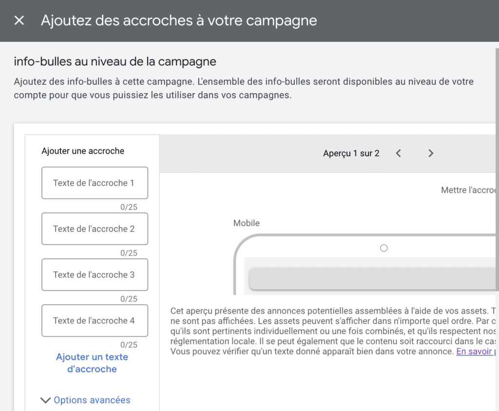 Passons en revue dès à présent chacune des extensions d’annonces à disposition lors de la création d’une campagne Google Ads.