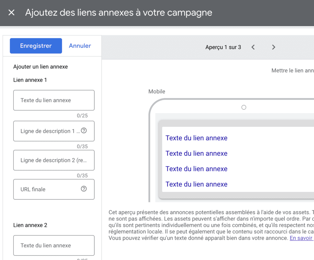 Elle correspond à l’ajout de liens cliquables en bas de vos titres & descriptions, vers des pages web complémentaires à l’URL finale de votre annonce.