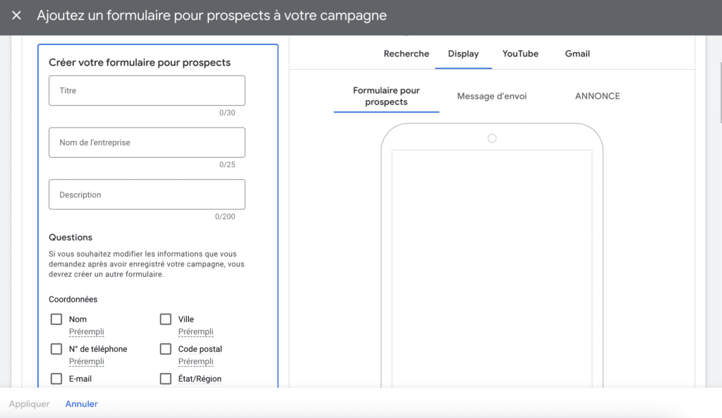 Il vous faudra à cette occasion accepter les conditions d’utilisation de Google Ads à ce sujet, créer le formulaire avec les différents champs d’informations à collecter, renseigner un message de confirmation, choisir un bouton d’appel à l’action ainsi que la méthode de récupération des données de prospects.