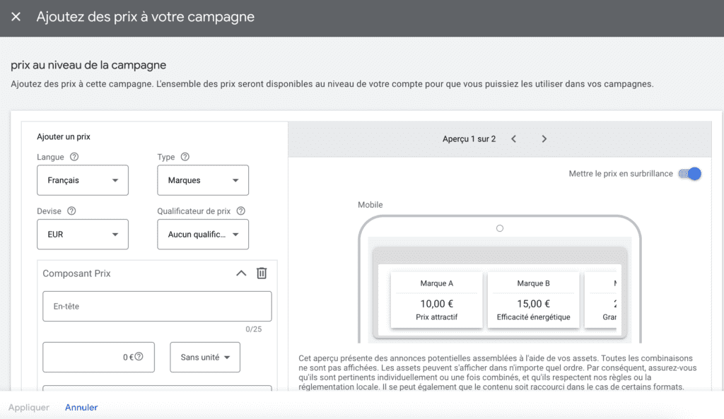 Ces extensions vous permettent de lister des items spécifiques avec leur prix ainsi qu’une description. Une partie de l’extension provient d’un modèle fourni par Google Ads comme les produits listés, la devise et les qualificatifs de prix.