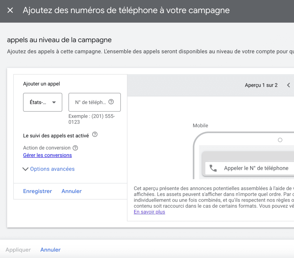 Par exemple, vous pourriez décider d’ajouter une extension d’annonce « Numéro de téléphone » afin de faciliter la prise de contact directement depuis la publicité.