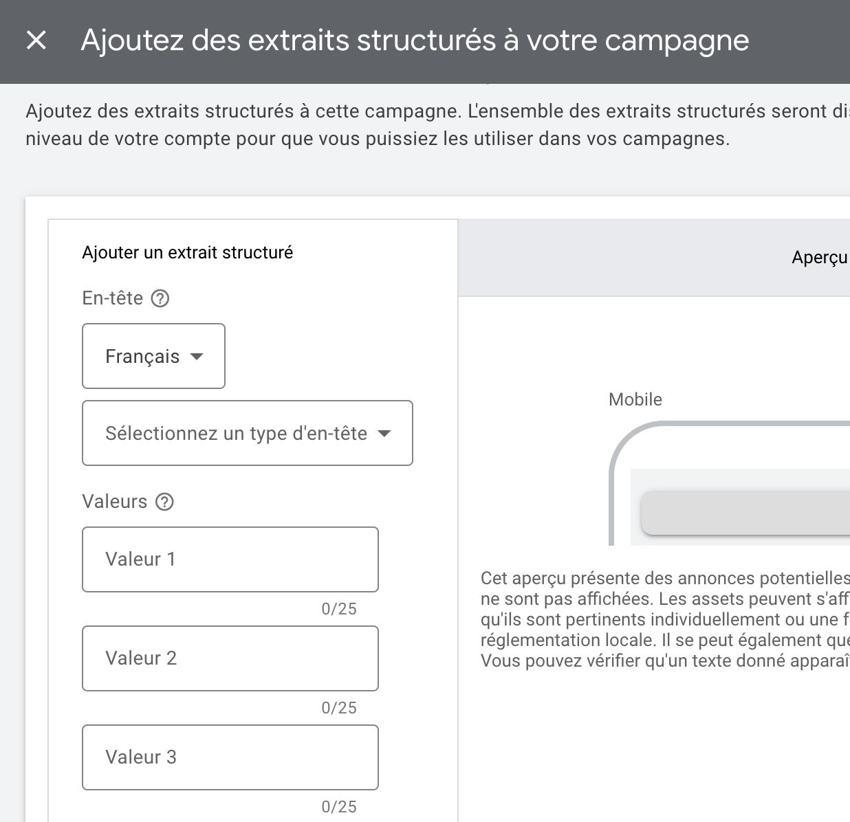 Pour paramétrer une extension d’extraits structurés, vous devrez choisir un en-tête parmi les choix suivants :