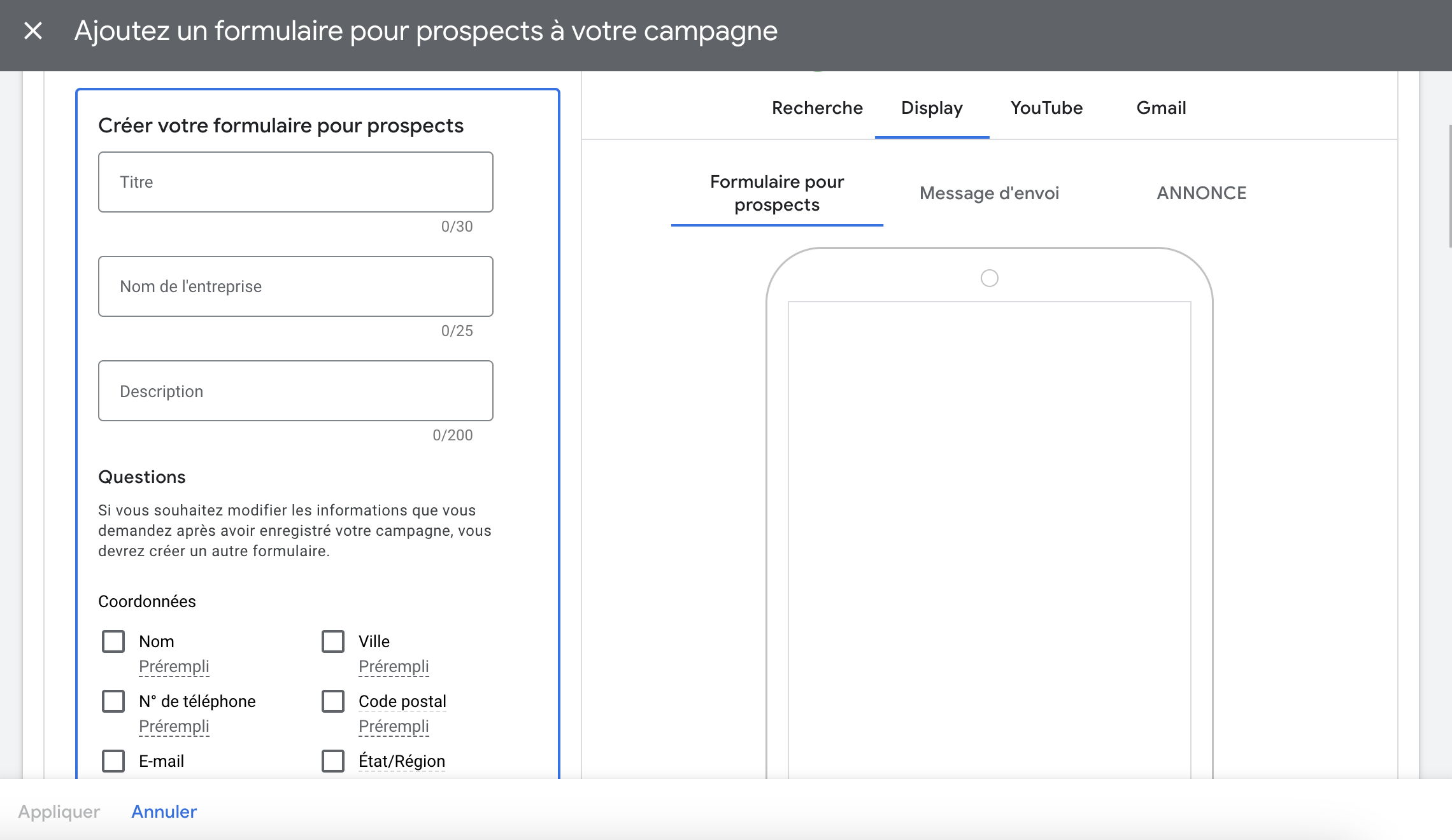 Il vous faudra à cette occasion accepter les conditions d’utilisation de Google Ads à ce sujet, créer le formulaire avec les différents champs d’informations à collecter, renseigner un message de confirmation, choisir un bouton d’appel à l’action ainsi que la méthode de récupération des données de prospects.