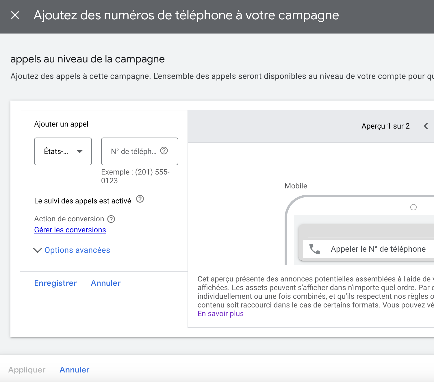 Par exemple, vous pourriez décider d’ajouter une extension d’annonce « Numéro de téléphone » afin de faciliter la prise de contact directement depuis la publicité.