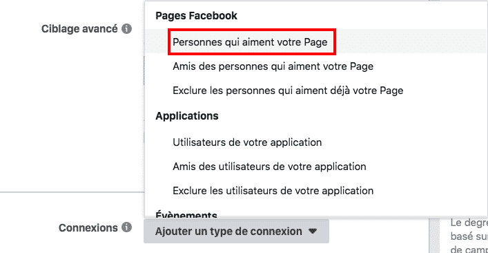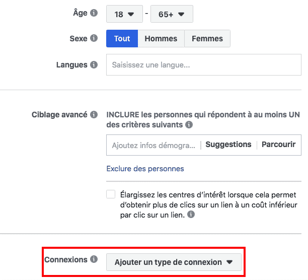 Facebook vous facilite la tâche en ayant prévu une fonctionnalité de ciblage toute prête pour atteindre uniquement les fans de votre page. Pour accéder à cette option, il vous suffit de vous rendre au niveau de l’écran de paramétrage de ciblage de l’audience potentielle visée par la campagne, et chercher la rubrique « Connexions » :