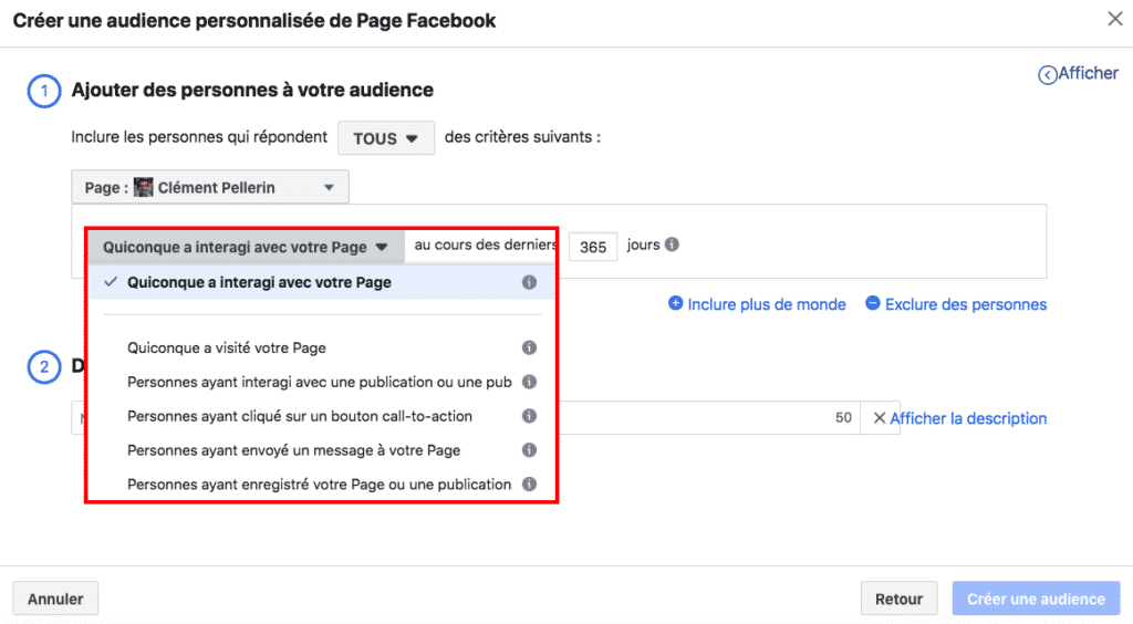 Il vous sera ensuite proposé dans la liste la bonne option à savoir « Personnes qui aiment votre page » :
