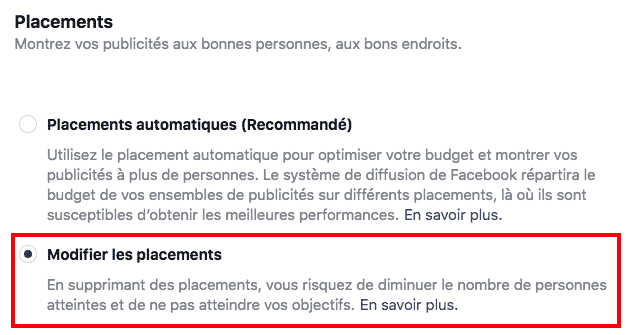 Il est essentiel de veiller donc à ce que votre publicité ne s’affiche uniquement que sur Instagram. Pour cela, cliquez sur « Modifier les placements » lorsque cela vous est proposé :