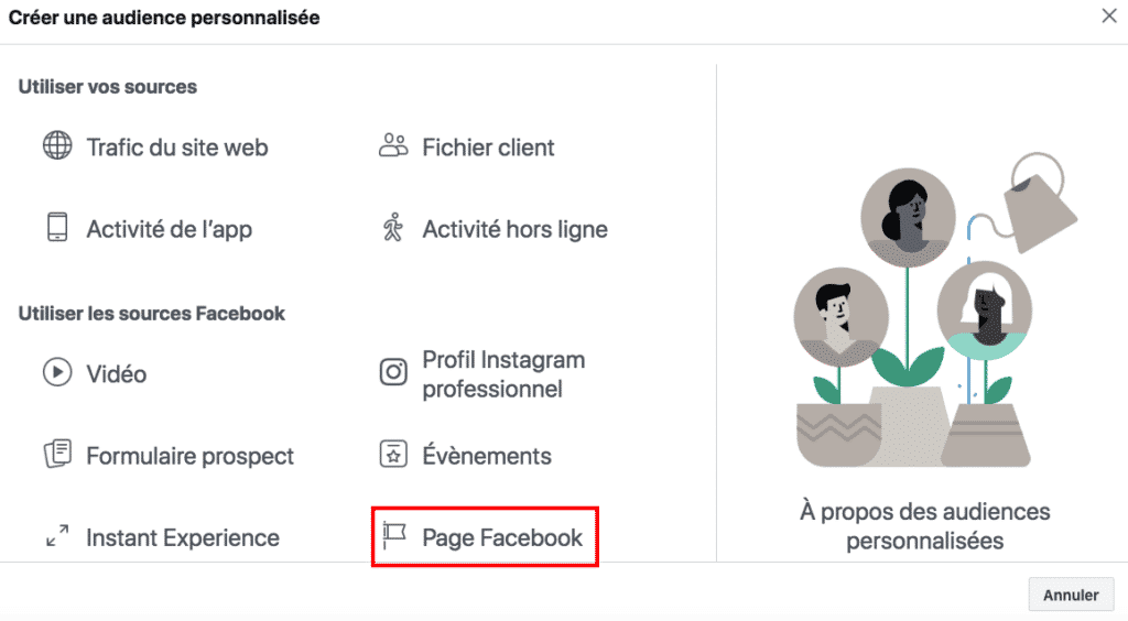 Les données d’interactions de page Facebook se situent au niveau des audiences personnalisées. Rendez-vous dans votre Business Manager puis dans l’outil « Audiences » afin de créer une audience correspondante. Après avoir cliqué sur le bouton bleu « Créer une audience » puis « Audiences personnalisées », cliquez sur « Page Facebook » tel que ci-dessous :