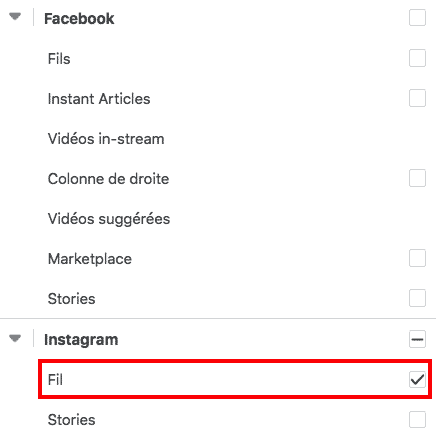 Dans la liste, il vous suffira de ne laisser coché uniquement le placement « Fil » dans la rubrique Instagram tel que ci-dessous :