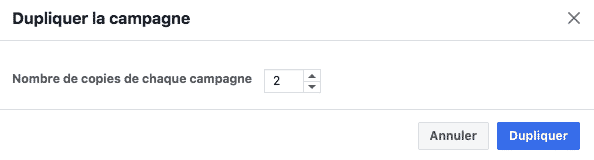 Dans la fenêtre permettant la duplication, soyez sûr que votre campagne & ensemble de publicités soient bien associés/sélectionnés. Ensuite, cliquez sur le bouton bleu « Dupliquer » et une copie sera alors ajoutée dans votre gestionnaire de publicités.