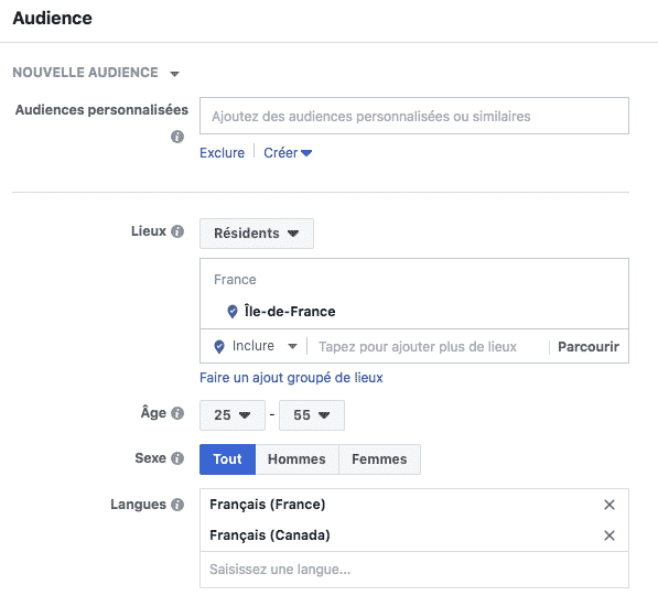 Selon le niveau de l’entonnoir de vente correspondant à la campagne, vous pourrez tester de nouvelles audiences froides en exploitant les centres d’intérêts de votre secteur d’activité et différentes audiences similaires.