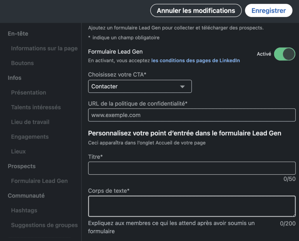 Dans le menu de gauche, cliquez sur « Modifier la page » puis sur « Formulaire Lead Gen ».