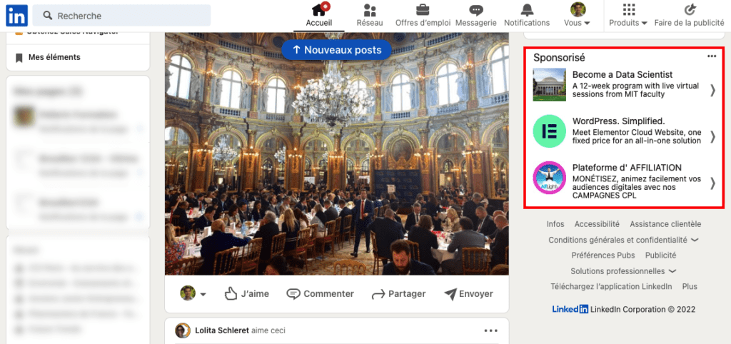 - apparait : dans la barre à droite de l’accueil LinkedIn sur ordinateur