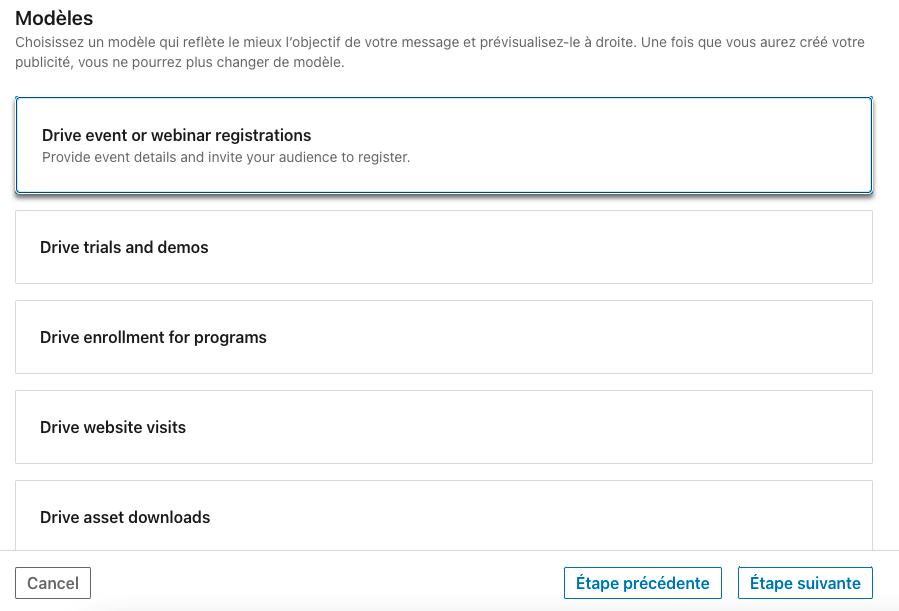 - Event Ad (publicité permettant de promouvoir vos évènements de page LinkedIn)