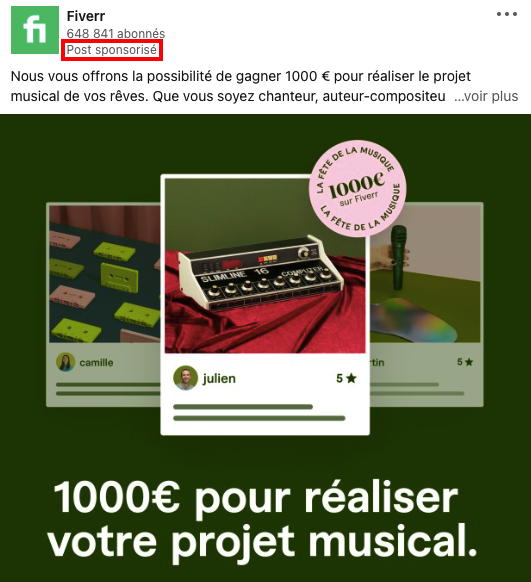 Il se camoufle si bien que seule la mention « Post sponsorisé » permet de se rendre compte que c’est une publicité, juste en dessous du nom de l’entreprise.