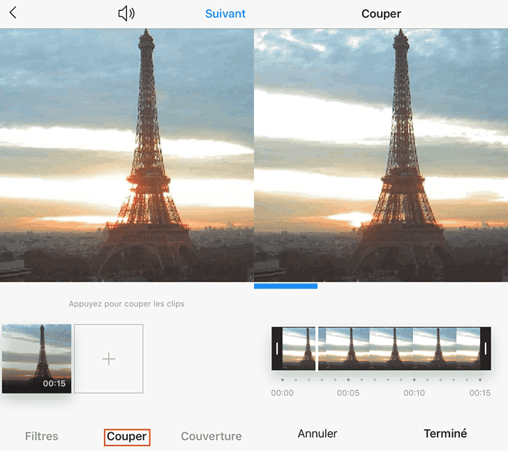 Dans le cas où vous souhaitez mettre en ligne une vidéo de plus de 15 secondes, Instagram coupera celle-ci de manière automatique en plusieurs segments de 15 secondes au plus.