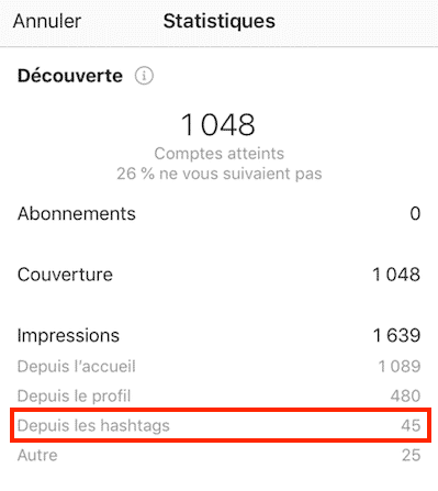 Pour accéder à cette information, sélectionnez la publication de votre choix, cliquez sur « Voir les statistiques », puis faites glisser l’écran vers le haut pour accéder aux données complètes. Vous verrez alors une ligne, si vous avez ajouté des hashtags pour cette publication, du nombre d’affichages gagnés grâce à l’intégration de hashtags :
