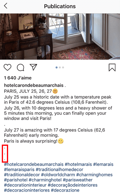 Il existe deux grandes méthodes pour rendre vos hashtags moins visibles pour vos abonnés. La première est la plus utilisée : insérer des puces noires, souvent au nombre de trois au minimum, afin de bien séparer le texte de la légende et les hashtags. En voici un exemple ci-dessous :