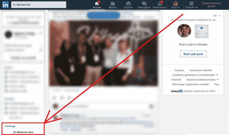 Depuis votre accueil, LinkedIn vous proposera des hashtags régulièrement utilisés par vos contacts, ce qui est une bonne source d’inspiration. Pour y accéder, cliquez sur « Voir plus » sur la gauche de votre écran tel que ci-dessous :