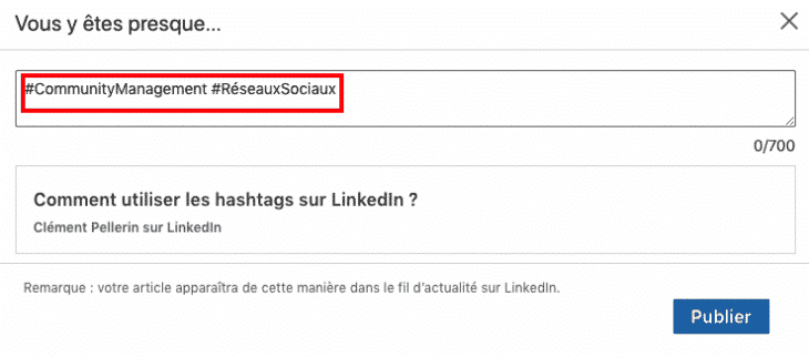 Depuis la page d’accueil, cliquez sur « Ecrivez un article » en dessous de l’encart de création d’une nouvelle publication. Lorsque vous êtes prêt à publier votre article, cliquez sur « Publier » en haut à droite. Une fenêtre pop-up telle que ci-dessous apparaîtra. Renseignez alors le ou les sujet(s) abordé(s) ainsi que des hashtags pertinents.