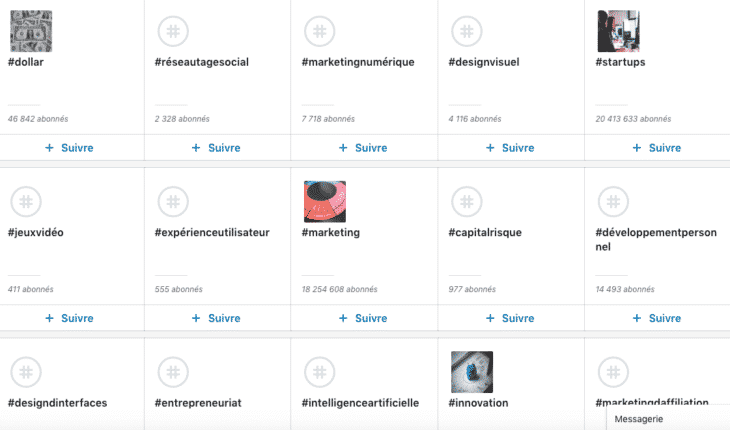 Vous pouvez suivre des hashtags en cliquant sur ceux-ci de manière individuelle ou vous pouvez les ajouter sur cet espace :