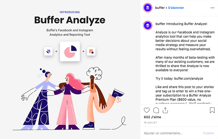 Par exemple, la société Buffer a annoncé par l’intermédiaire d’un post l’arrivée d’une nouvelle option sur son site Internet. Elle explique en détail en quoi consiste ce nouvel ajout dans la légende.