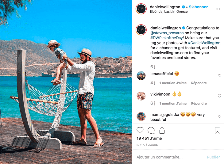 La marque de montres Daniel Wellington publie régulièrement des publications postées initialement par des clients, comme c’est le cas par exemple ci-dessous :