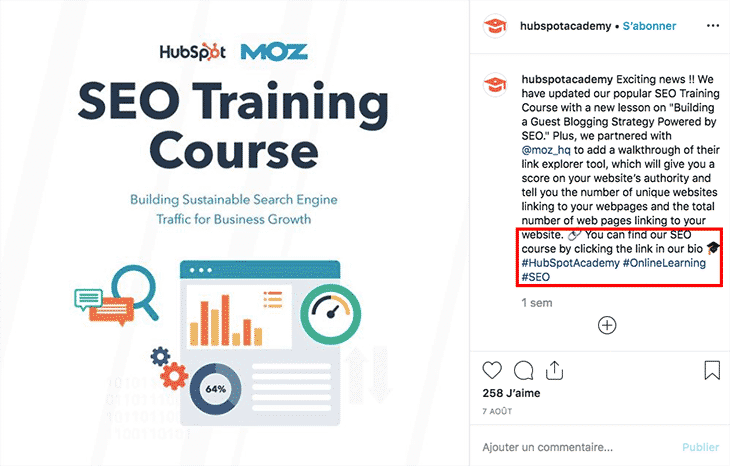C’est ce que propose régulièrement le compte Hubspot Academy, incitant dans la publication ci-dessous à cliquer sur le lien dans la biographie pour accéder au contenu promis.